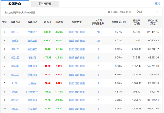 从三季度泉果基金的前十大行业配置看,制造业占比高达53.23%,其次为软件和信息技术服务业,占比3.88%。前十大重仓股,分别为宁德时代、腾讯控股、立讯精密、科达利、恩捷股份、天赐材料、快手-W、阿里巴巴-W、应流股份、中芯国际,占基金净值比例在4.36%-9.27%之间。