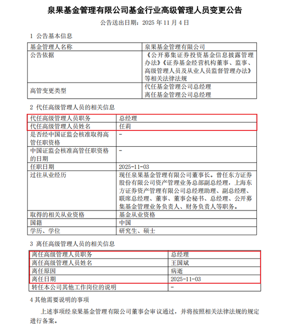 11月3日,泉果基金管理有限公司(下称“泉果基金”)创始人、总经理王国斌因病医治无效,于当日不幸逝世,董事长任莉代任总经理。目前,泉果基金官网已更换为黑白色调。
