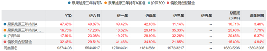 自成立以来,泉果旭源三年持有混合总回报为10.71%,近6个月、近1年、近2年、近3年均取得了正收益,分别为:47.46%、49.87%、42.83%、11.14%。尤其是近6个月在同类4617只基金中,排在第554位,收益率表现较为优秀。